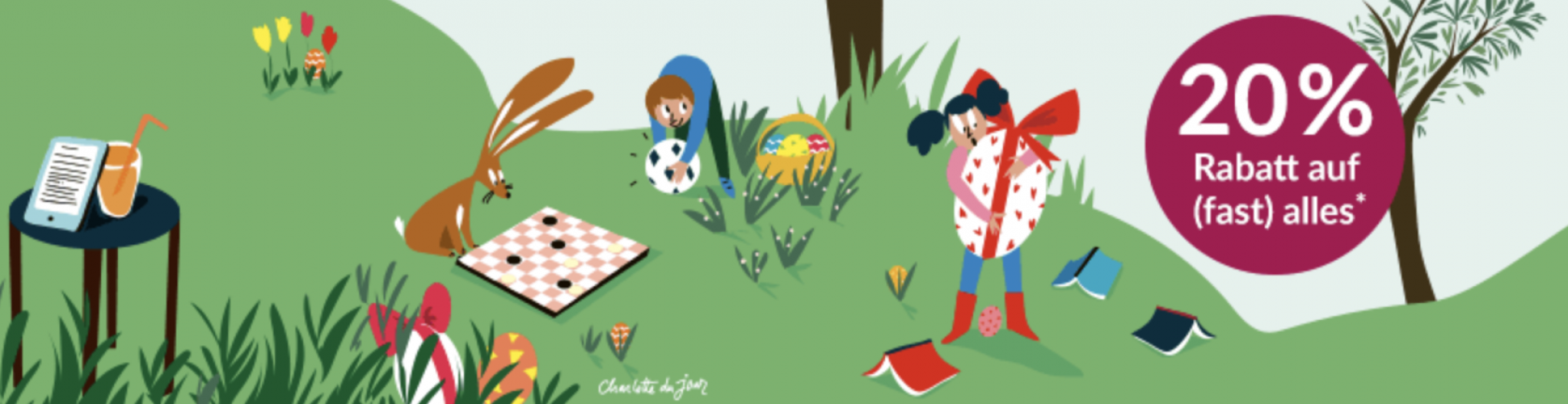 *Gültig bis 09.04.2023 auf (fast) alles. Ausgeschlossen sind Tonieboxen, Smartboxen, Zeitschriften, Lebensmittel, Tickets, Gaming-Elektroartikel, Tinte/Toner, Gutscheine, Geschenkkarten und Abos | Einlösbar in allen Buchhandlungen von Orell Füssli, Barth Bücher, Stauffacher und ZAP gegen Abgabe des Gutscheins, auf orellfüssli.ch durch Eingabe des Gutscheincodes. Beim Service „eBooks verschenken“ und bei eBook-Käufen via eReader nicht einlösbar | Nicht mit anderen Rabatten kumulierbar.