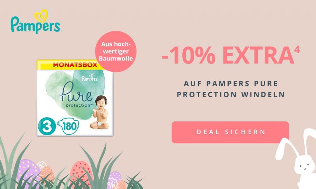 Bei windeln.ch gibts bis zum 28.3. diverse Osterangebote. So gibt’s zum Beispiel die Windeln Pampers Pure Protection aus Baumwolle mit 10% Rabatt. Die meisten anderen Anbieter (Galaxus, Brack, babyjoe, microspot) verlangen in etwa den gleichen Preis vor Rabattabzug.