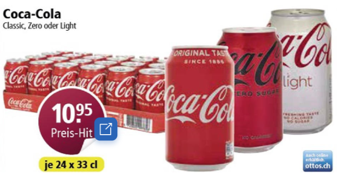 Los geht’s mit dem Lieblings-Softdrink vieler von euch: Coca Cola! Diese gibt’s in den drei Variationen Classic, Light und Zero im 24er-Pack für 10.95 Franken. Laut Recherche wäre Denner der zweitgünstigste Anbieter mit einem Preis von 11.20 Franken. Ihr seht also, dass keine wahnsinnige Ersparnis drinliegt. Sicher interessant für Leute, welche näher bei einem Otto’s leben, da auch sonst kein 10 Franken Gutschein online ist.