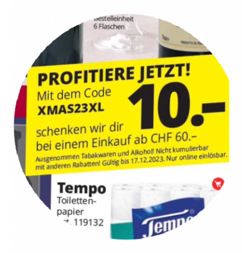 Noch ein 10 CHF Gutschein falls ihr alle anderen schon verbraucht habt ;-). Gültig bis 17.12.23 wie immer ohne Alkohol und Tabak ab 60 CHF.