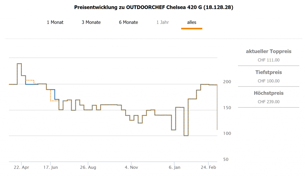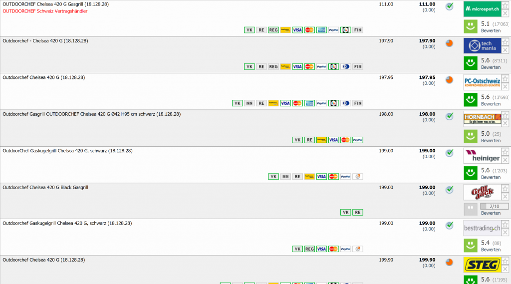 Bei microspot gibt’s gerade den OUTDOORCHEF Chelsea 420 G Gasgrill für CHF 101, wenn man den Gutscheincode MSP10 bei der Kasse angibt. Bestpreis war CHF 100.-