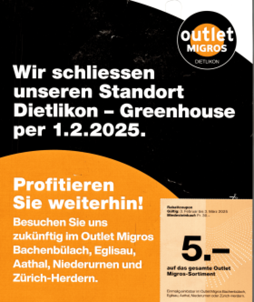 Migros schliesst den Standort Dietlikon - Greenhouse zum 1. Februar 2025, aber keine Sorge: Ihr könnt weiterhin in anderen Migros-Outlets von tollen Angeboten profitieren!