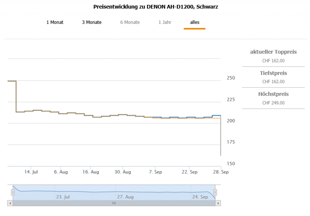 Gemäss toppreise gab es den Kopfhörer bislang nie günstiger als für 205.75 CHF was zugleich aktuell auch der zweitbeste Preis ist.