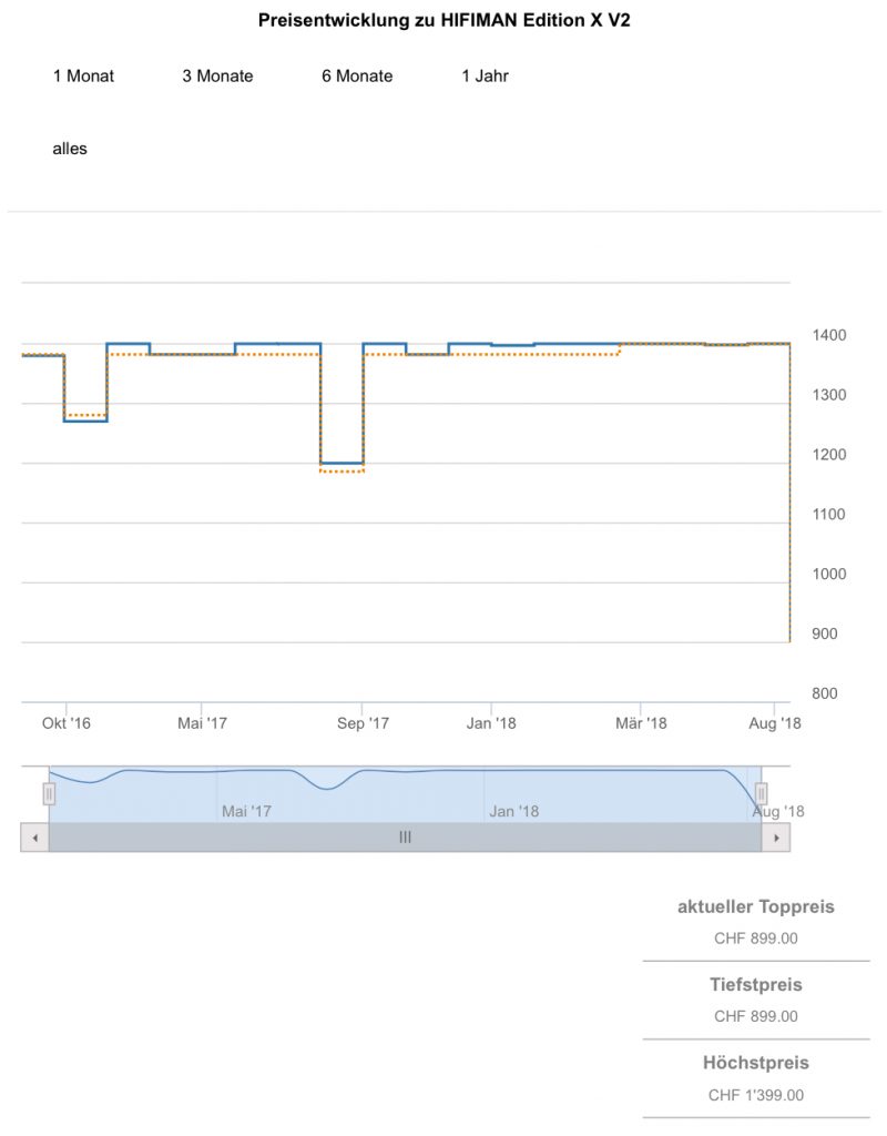 Gemäss toppreise gab es den Kopfhörer bislang nie günstiger als für 1185.02 CHF, der zweitbeste Preis liegt aktuell bei 1399.- CHF.