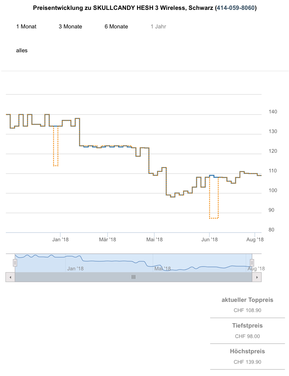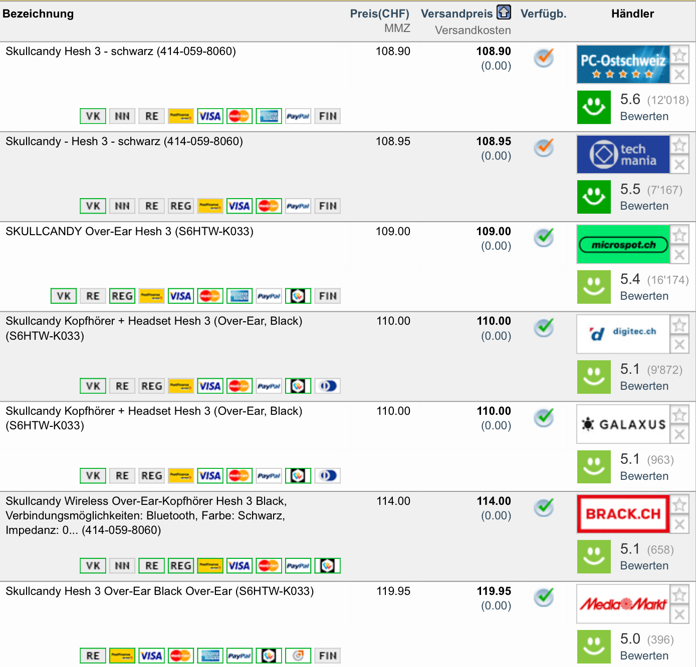 Gemäss toppreise gab es die Kopfhörer bislang nie günstiger als für 87.20 CHF, der zweitbeste Preis liegt aktuell bei 108.90 CHF.