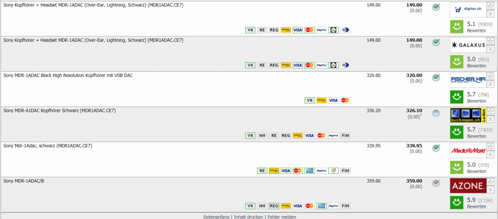 Bei digitec gibt’s gerade die Sony MDR 1 ADAC zum guten Preis von CHF 149.- Der zweitbeste Preis in der Schweiz liegt bei CHF 320.- Der bisher günstigste Preis lag bei CHF 179.-