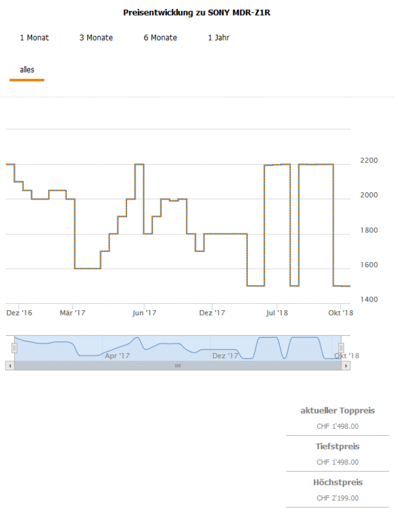 Gemäss toppreise gab es den Kopfhörer bislang nie günstiger als für 1498.- CHF, was aktuell auch der zweitbeste Preis ist.