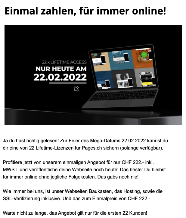 Gerade Newsletter erhalten über welchen die ersten 22 Kunden eine Lifetime-Lizenz für den Webseiten Baukasten Pages.ch erwerben können. Nutze Pages.ch selber und bin sehr zufrieden, habe nun auf eine Lifetime-Lizenz gewechselt! Gibt also nur noch 21… 😂