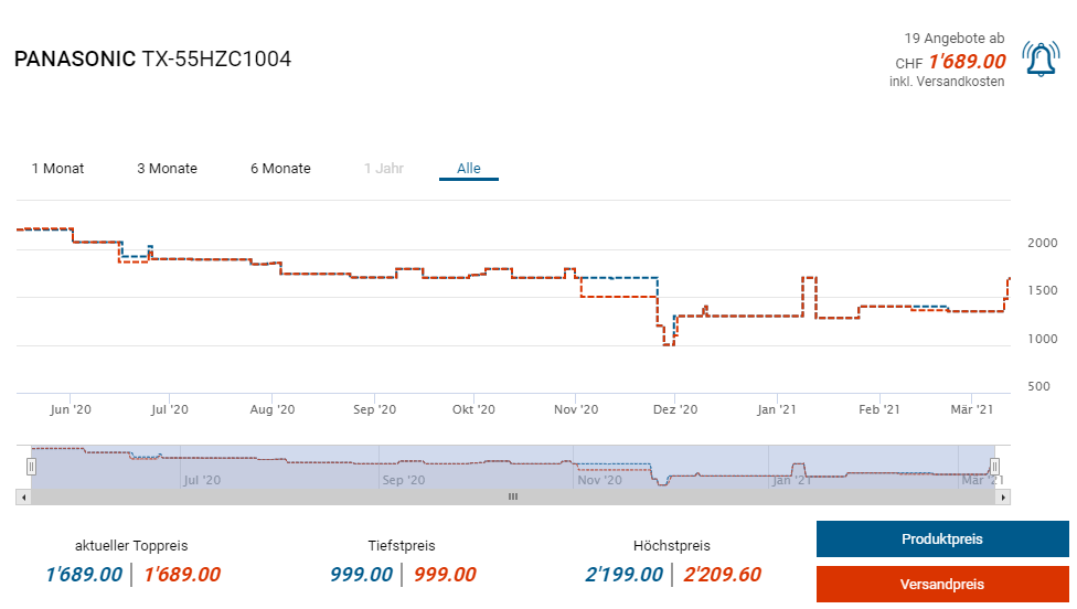 Bei QoQa gibts derzeit den 55 Zoll grossen OLED-Fernseher 55HZC1004 von Panasonic zum Bestpreis von 999 Franken. Laut toppreise lag dieser zuletzt am Black Friday so tief. Als Vergleichspreis nehme ich aber das 65 Zoll Modell, das für 1599 Franken erwerbbar ist.