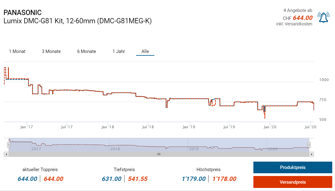 Bei Amazon kann man sich derzeit die Kamera Panasonic DMC-G81 „vorbestellen“. Die Kamera gibts eigentlich bereits seit 3 Jahren auf dem Markt aber scheinbar ist sie nicht direkt verfügbar, weshalb ihr euch wohl einige Tage/Wochen gedulden müsst. Alternativ gibts die Kamera beim zweitgünstigsten Anbieter digitec für 644 Franken.