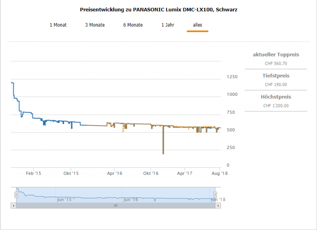 Gemäss Toppreise war der günstigste, je gemessene Preis bei CHF 190.-, was jedoch eher auf einen Preisfehler schliessen lässt. Der zweitbeste Preis aktuell liegt bei CHF 560.70