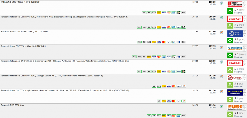 Bei Interdiscount gibt’s gerade die PANASONIC Lumix DMC-TZ81 für CHF 159.90 Das ist neuer Bestpreis. Zweitbester Preis: CHF 266.-