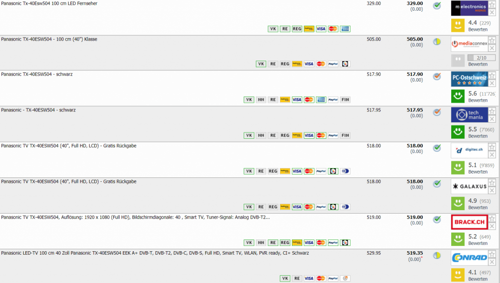 Bei melectronics erhält man gerade den Panasonic TX-40ESW504 40“ Edge-LED Fernseher für CHF 319.- wenn man den Newsletter-Anmeldungsrabatt einsetzt. Der zweitbeste Preis in der Schweiz liegt bei CHF 505.- Günstiger als für CHF 457.- erhielt man den TV in der Schweiz bislang noch nie.