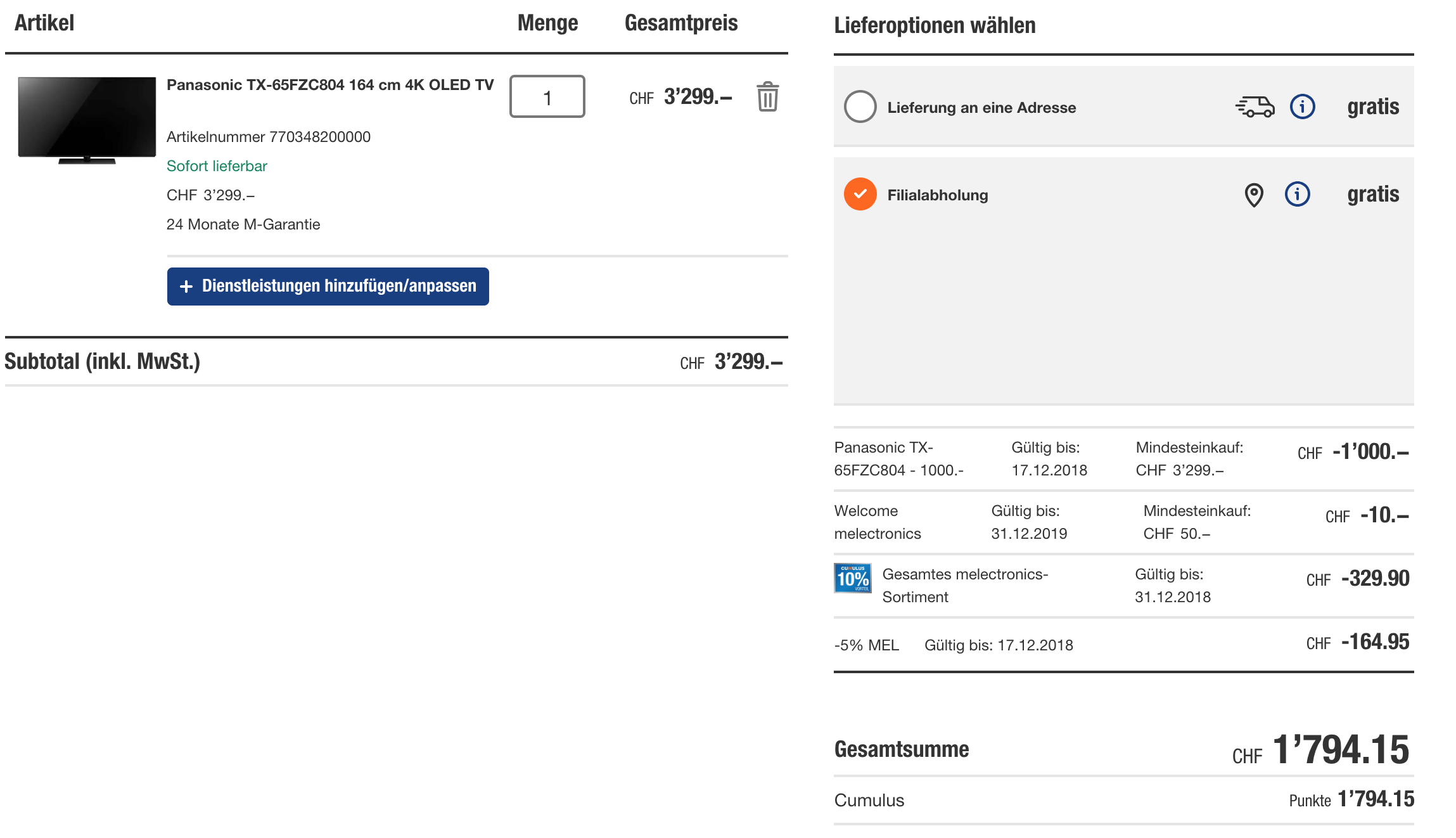 Bei melectronics gibt’s den 65″ OLED TV von Panasonic zum unschlagbaren Preis von CHF 1794.15 dank Cumulus-Vorteil und Gutscheincodes.
