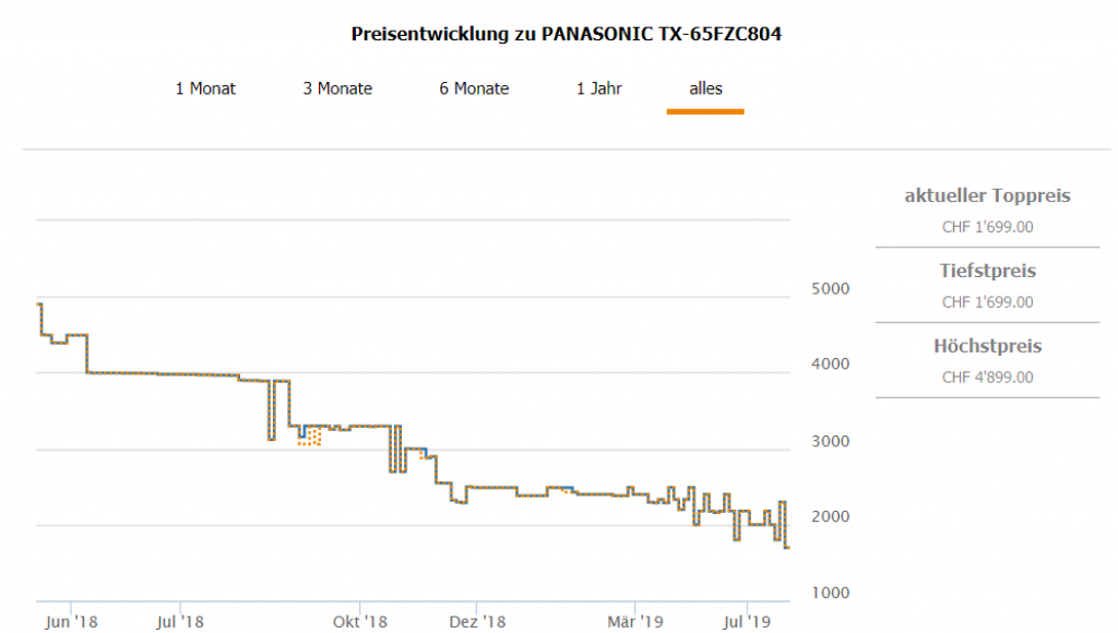 Bei digitec gibt’s gerade den PANASONIC TX-65FZC804 für CHF 1699.- Bestpreis bisher scheint bei CHF 1794.- gewesen zu sein. Zweitbester Preis beträgt momentan CHF 2390.-