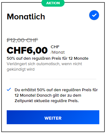 CHF 6.- / Mt. CHF 12.- / Mt. -50% Zum Deal