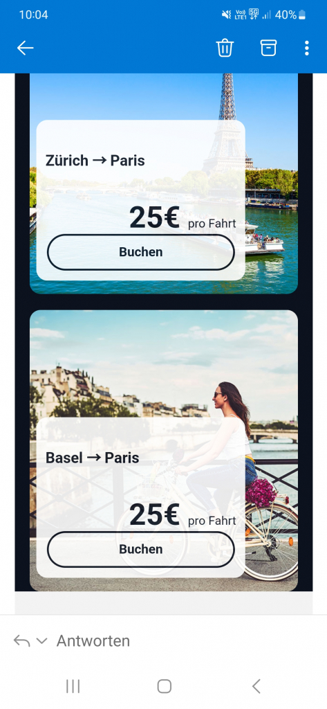 Man kann noch bis Morgen ein Ticket mit TGV Lyria für 25 Euro (pro Fahrt) nach Paris buchen. Buchungszeitraum gilt zwischen 20. Juni und 21. September 2023, aber nur am Dienstag, Mittwoch, Donnerstag und Samstag ab Basel, Zürich, Genf, Lausanne oder Vallorbe.
