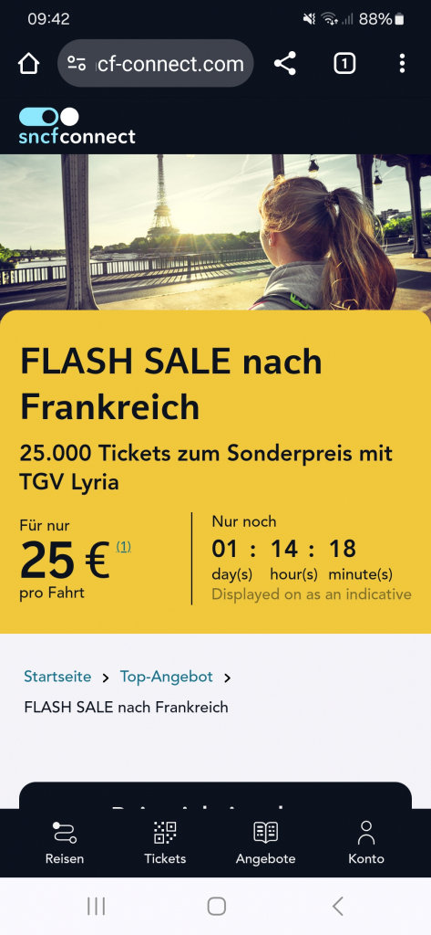 Bis Morgen Nacht kann man bei TGV Tickets ab Genf, Lausanne, Basel oder Zürich für Fr. 25.- pro Fahrt buchen.