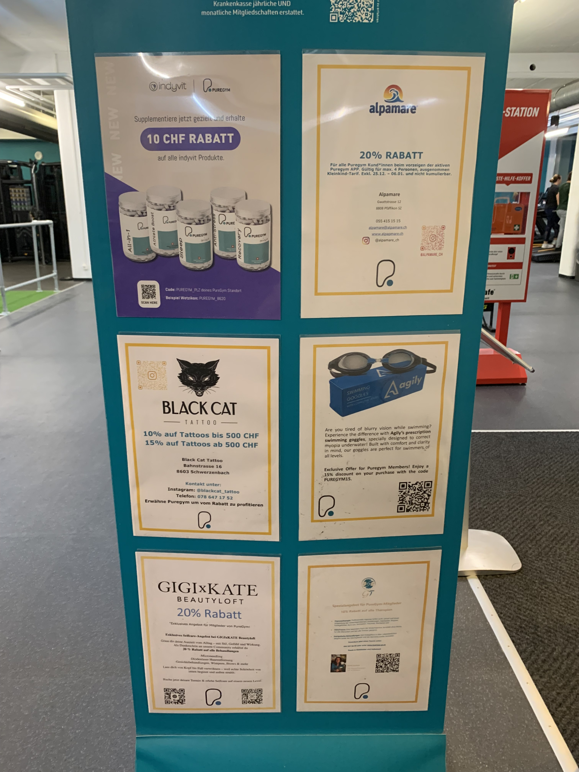 Für alle Puregym-Mitglieder gibt es einige Zusatzangebote. Schaut mal auf das Bild. Unteranderem könntet ihr durch Vorzeigen der Mitgliedschaft unteranderem einen vergünstigten Eintrittspreis beim Alpamare, ein günstigeres Tattoo oder eine günstigere Schwimmbrille ergattern.