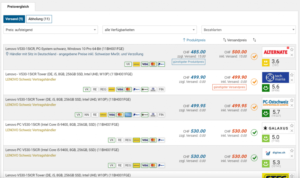 Bei Daydeal gibts heute den Office-Desktop-PC von Lenovo, eine Konfiguration des ThinkCentre V530 mit i5-9400-Prozessorm 8GB RAM und 256GB SSD zum Aktionspreis von 449 Franken. Genau die gleich ausgestattete Maschine zu finden gestaltet sich recht schwammig, ich habe jetzt einfach diesen PC hier genommen, da er auch am günstigsten ist.