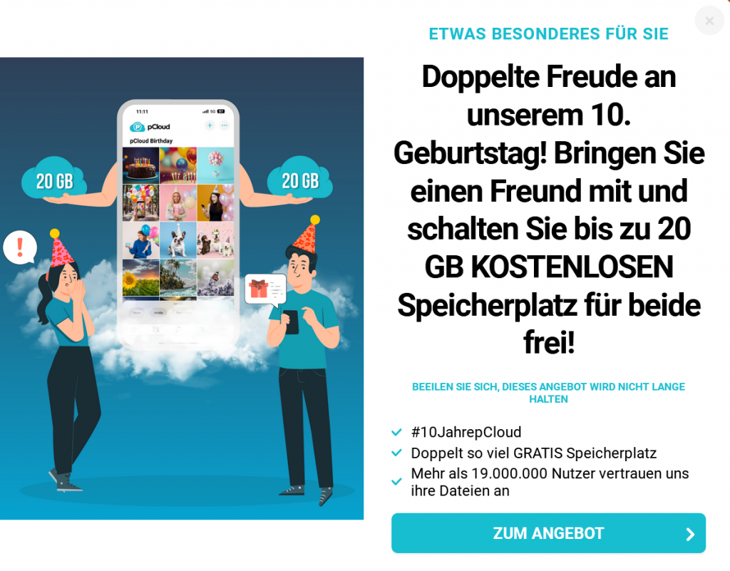NUR KURZ: pCloud feiert gerade 10 Jähriges, 20GB gibt es einfach geschenkt. Vielleicht sucht hier jemand gerade eine gute Dropbox-Alternative 😉
