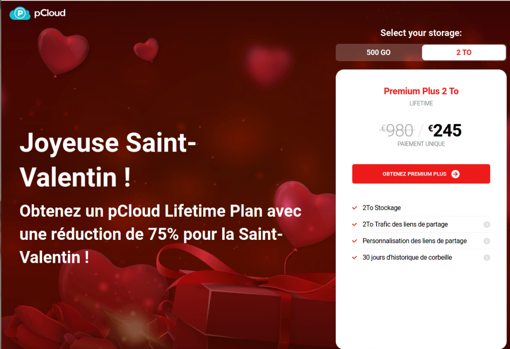 Maintenant pour 245€ (264 CHF) vous pouvez acheter à vie (ou jusqu’à la faillite de l’entreprise) 2TO cloud drive chez Pcloud. Aussi disponible 500gb pour 122€