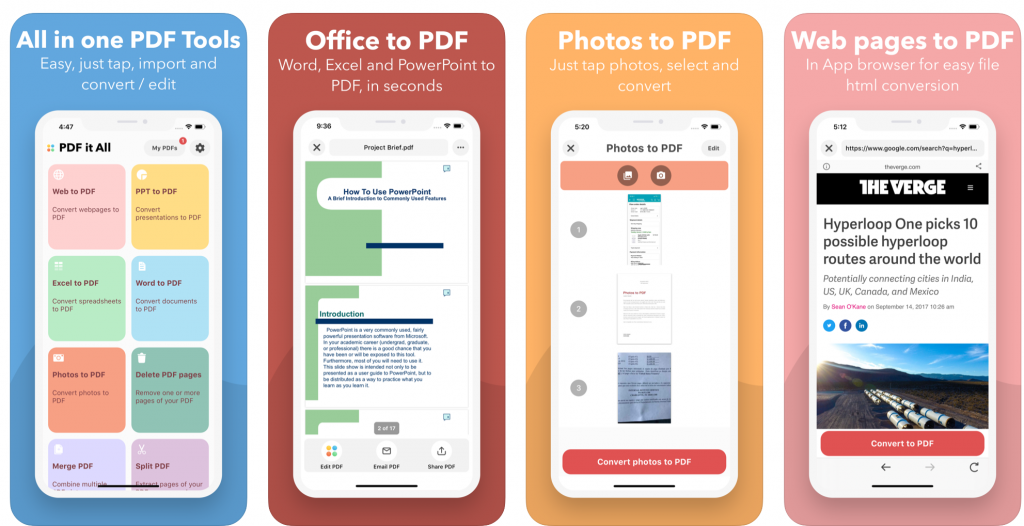PDF it All is an advanced and yet very simple to use PDF tool that allows to edit/convert PDF files. Convert Word,Excel, PowerPoint, Web pages and photos to PDF. Want to edit a PDF by removing, rotating pages? You got it. Want to merge multiple PDFs into one file or split a PDF into multiple files? You got it. Best of all, our app does not use external servers. Our app does every PDF task in your device, keeping your files 100% secure.