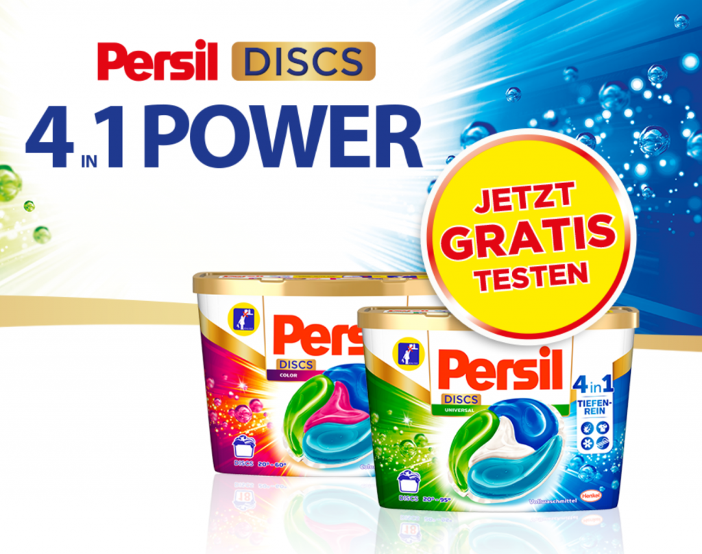 - Um an der Persil GRATIS TESTEN Aktion teilzunehmen, kaufen Sie im Kaufzeitraum vom 02.01.2020 bis zum 30.04.2020 innerhalb Deutschlands und der Schweiz (online oder bei teilnehmenden Händlern) eine Packung Persil DISCS Universal/Color mit 14 oder 18 Waschladungen. Anschließend machen Sie ein Foto des Original-Kassenbons oder der Original-Rechnung des Online Händlers und laden dieses Foto, bis zum 15.05.2020, 23:59 Uhr, auf gratistesten.persil.de hoch.