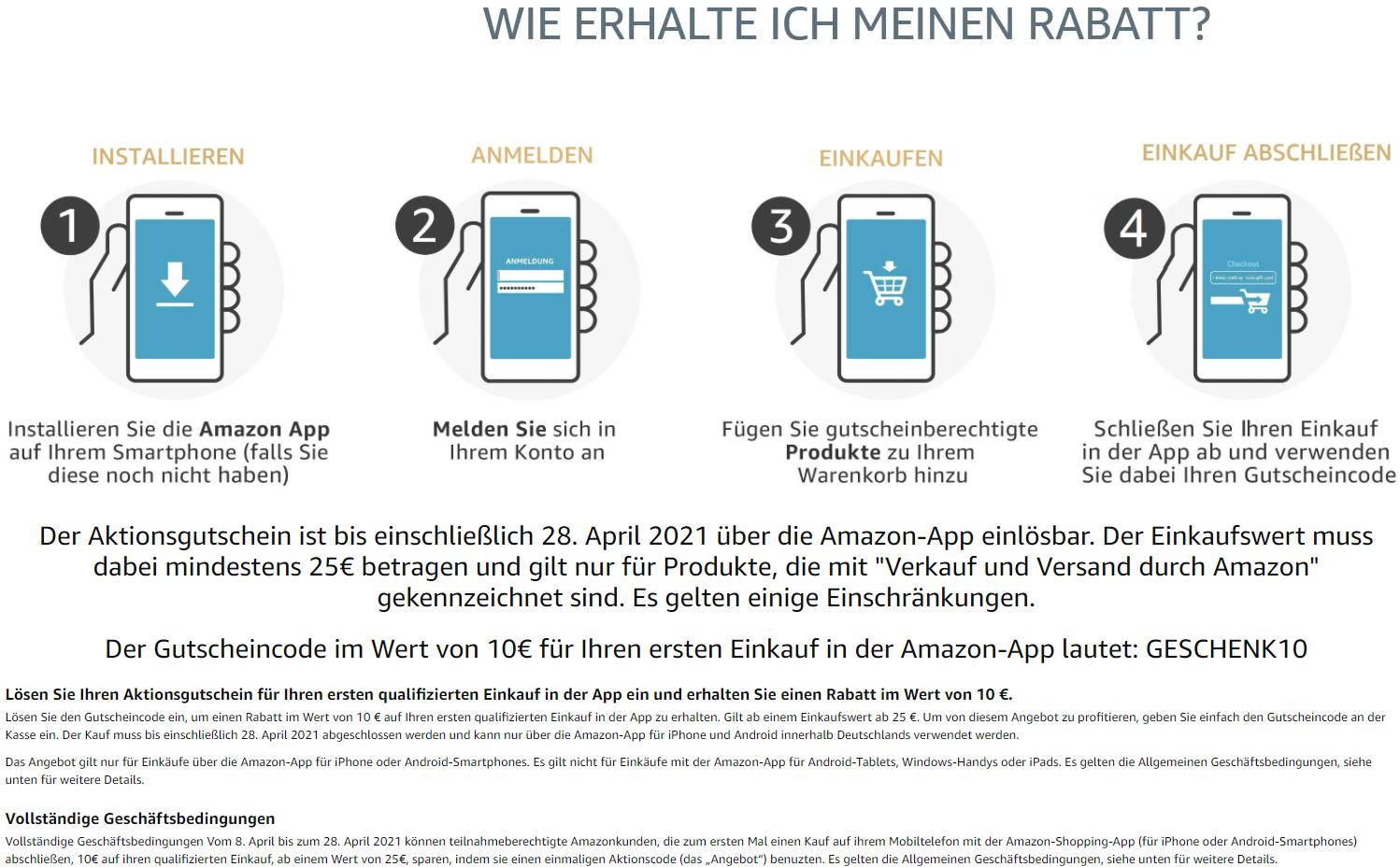 Vollständige Geschäftsbedingungen Vom 8. April bis zum 28. April 2021 können teilnahmeberechtigte Amazonkunden, die zum ersten Mal einen Kauf auf ihrem Mobiltelefon mit der Amazon-Shopping-App (für iPhone oder Android-Smartphones) abschließen, 10€ auf ihren qualifizierten Einkauf, ab einem Wert von 25€, sparen, indem sie einen einmaligen Aktionscode (das „Angebot“) benuzten. Es gelten die Allgemeinen Geschäftsbedingungen, siehe unten für weitere Details.