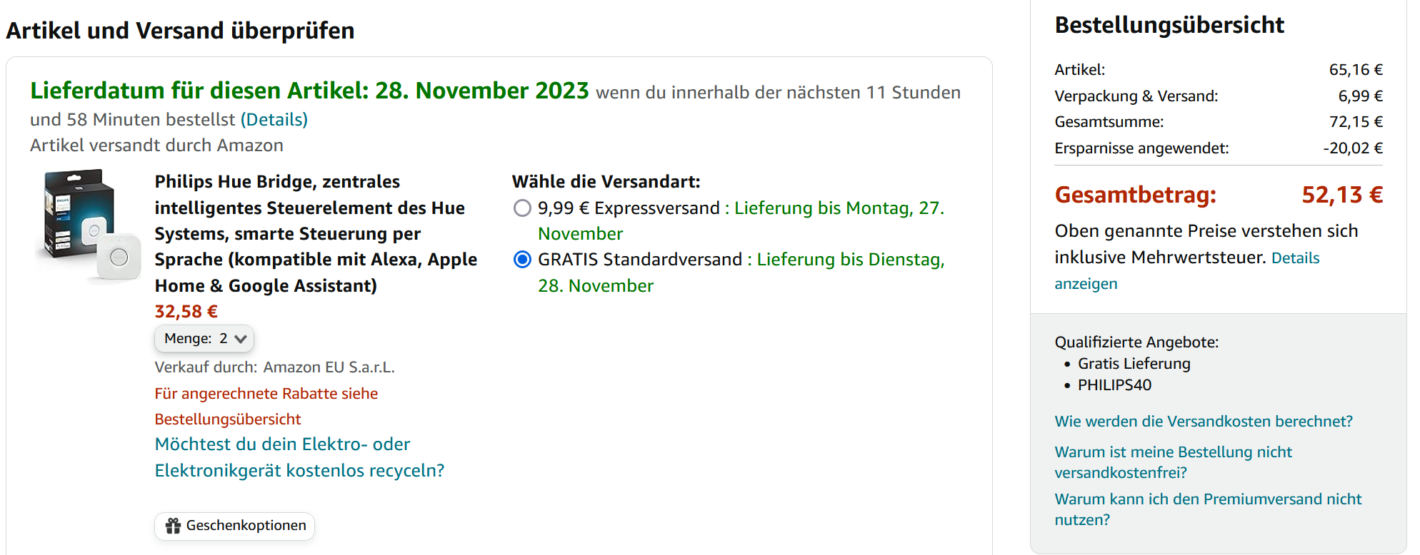 Beispiel: 2x Hue Bridge um insgesamt €52,13 (also ca. €26 pro Stück) mit Gratislieferung. (Funktioniert aber auch mit zwei unterschiedlichen Artikeln.)