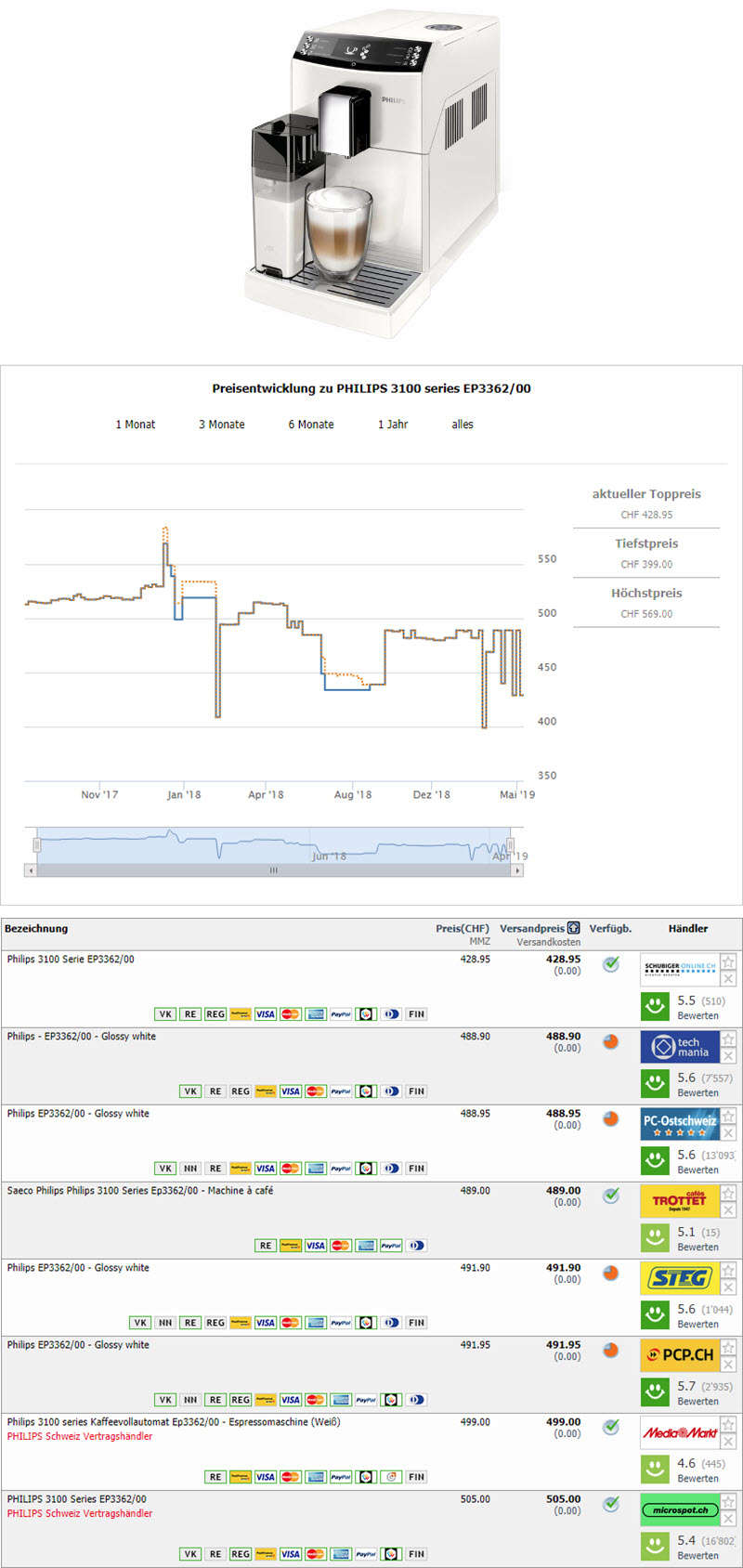 Bei Nettoshop gibt es bis und mit 21.5.2019 den Philips 3100 Serie EP3362/00 Kaffeemaschine Vollautomat (weiss) zum Bestpreis von CHF 379.- wenn man beim Checkout den CHF 20.- Rabattcode WIN1903-20 verwendet.