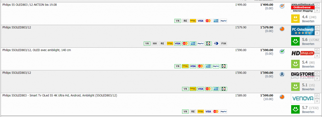 Bei Interdiscount gibt’s den PHILIPS 55OLED803/12 Smart TV (55″, OLED, Ultra HD - 4K) für CHF 999.90 Zweitbester Preis laut toppreise: CHF 1499.- Bestpreis bisher: CHF 1189.-