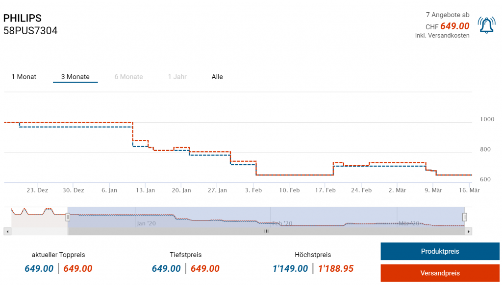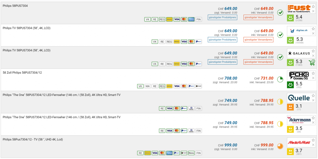 Bei Fust gibt’s den 58 Zoll PHILIPS 58PUS7304 mit Ambilight und 4K gerade für CHF 649.- Mit Gutscheincode 1120RM für CHF 629.- CHF 649.- ist Bestpreis - auch digitec ist mit dem Preis mitgezogen, deshalb ist die angegebene „Ersparnis“ so gering.