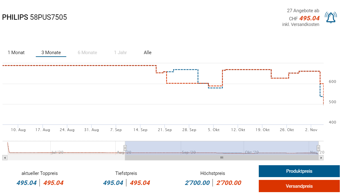 Beim eher unbekannteren Onlineshop variotrade.ch gibts derzeit den 58 Zoll grossen 4K-Fernseher PUS7505/12 von Philips zum Preis von knapp unter 500 Franken. Laut toppreise ist dies ein neuer Bestpreis für dieses Modell, die zweitbesten Preise starten ab 600 Franken.