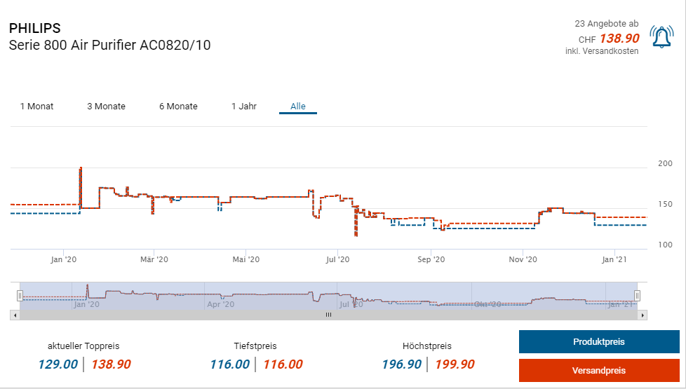 Bei Amazon Frankreich gibts derzeit den Luftreiniger Philips AC0820/10 zum Aktionspreis von knapp 107 Franken. Laut toppreise starten die Preise in der Schweiz bei etwa 139 Franken, der Bestpreis soll bei 116 Franken gelegen haben.