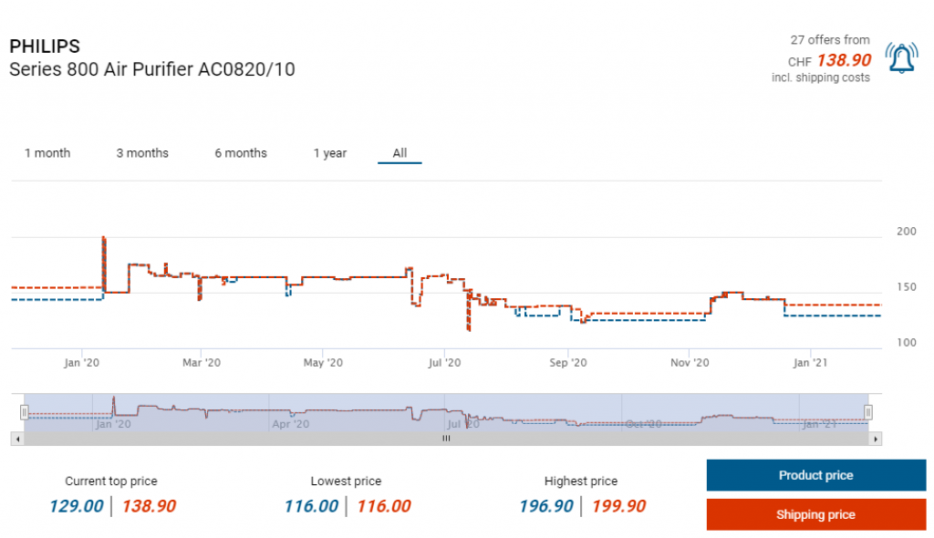 Bei philips.ch gibts derzeit den Luftreiniger AC0820/10 zum Aktionspreis von 146 Franken. Mit dem Newsletter-Trick gibts zudem 20% Rabatt (Newsletter-Anmeldung). So ergibt sich ein Preis von CHF 116.80, was etwa dem bisherigen Bestpreis entspricht.