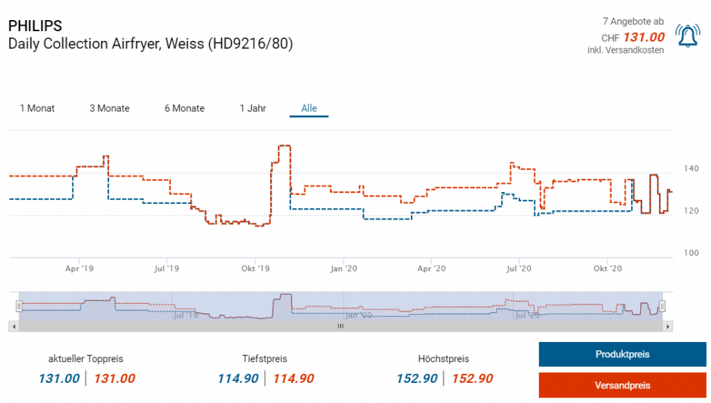 Bei amazon.fr gibts derzeit die Heissluftfriteuse HD9216/80 von Philips zum Schnäppchenpreis von lediglich 68 Franken. Laut toppreise unterbietet dies den bisherigen Bestpreis massiv, ansonsten starten die Preise auch bei geradezu stratosphärischen CHF 131.-.