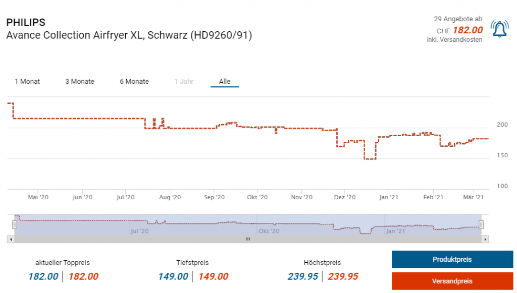 Im Philips Shop gibts derzeit das beliebte Fritiergerät Philips AirFryer XL, das ohne Öl auskommt, zum Aktionspreis von 189 Franken. Dank 20% Gutschein aus der Newsletter-Anmeldung drückt ihr den Preis schliesslich auf CHF 151.20. Laut toppreise liegt der Vergleichspreis bei CHF 182.-