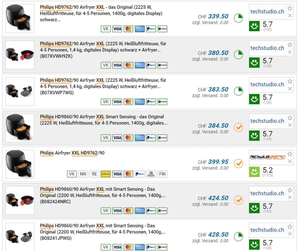 Bei Amazon gibts derzeit die Heissluftfritteuse in der XXL-Version von Philips zum Aktionspreis von 175 Franken. Laut toppreise starten die Preise für genau dieses Modell bei CHF 339.50.