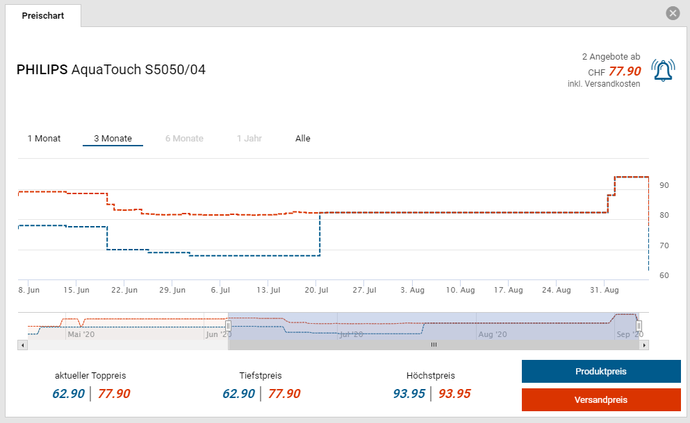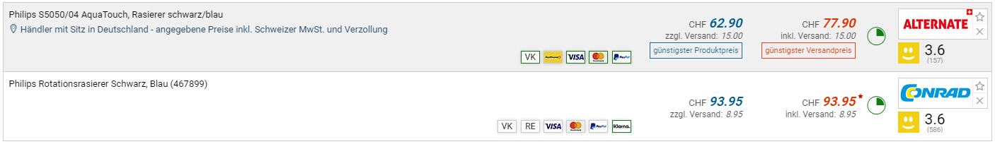 Bei Alternate gibt es den PHILIPS AquaTouch Rassierer für den Bestpreis von CHF 77.90. Der Preis war zuletzt im April so tief. Der zweitbeste Preis beträgt CHF 93.95.