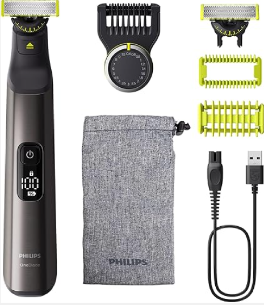Der Philips OneBlade Pro 360 Face & Body ist ein vielseitiger Hybridstyler, der trimmen, rasieren und präzise Konturen bei jeder Haarlänge ermöglicht. Die innovative 360-Grad-Klinge passt sich flexibel den Gesichtskonturen an und sorgt für eine angenehme Rasur auch an schwer erreichbaren Stellen. Mit 20 Längeneinstellungen und speziellen Aufsätzen für Gesicht und Körper bietet er maximale Kontrolle und Schutz der Haut. Die Klingen aus Edelstahl halten bis zu 4 Monate und der Akku ermöglicht bis zu 120 Minuten kabellose Nutzung. Zudem ist das Gerät vollständig wasserfest, was die Reinigung erleichtert und die Anwendung mit Schaum oder unter der Dusche erlaubt