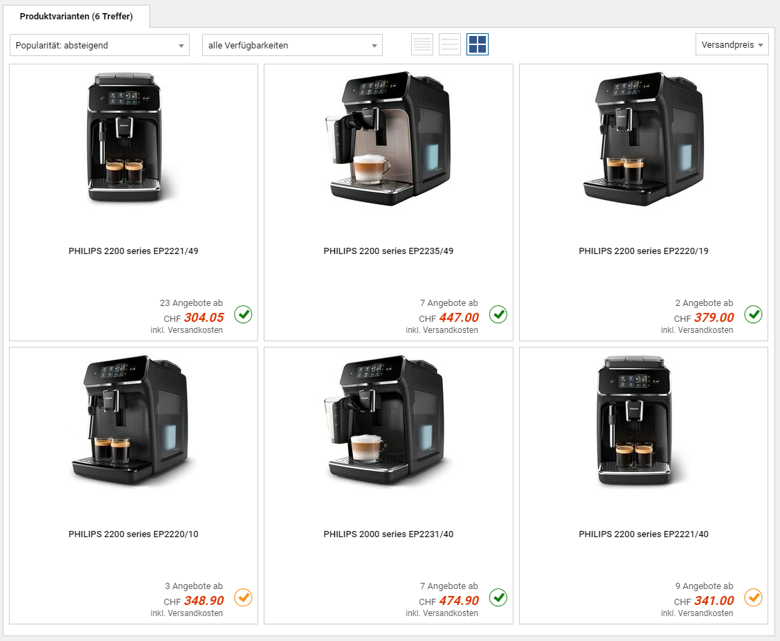 Bei amazon.fr gibts derzeit den Kaffeevollautomaten EP2200/10 von Philips zum Aktionspreis von 261 Franken inkl. Lieferung. In der Schweiz starten die Preise für diese Variante derweil bei knapp 349 Franken (laut toppreise), die Maschine mit der abgeänderten Nummer EP2200/19 wäre sogar erst ab 379 Franken erhältlich, inwiefern sich die beiden unterscheiden weiss ich aber nicht.