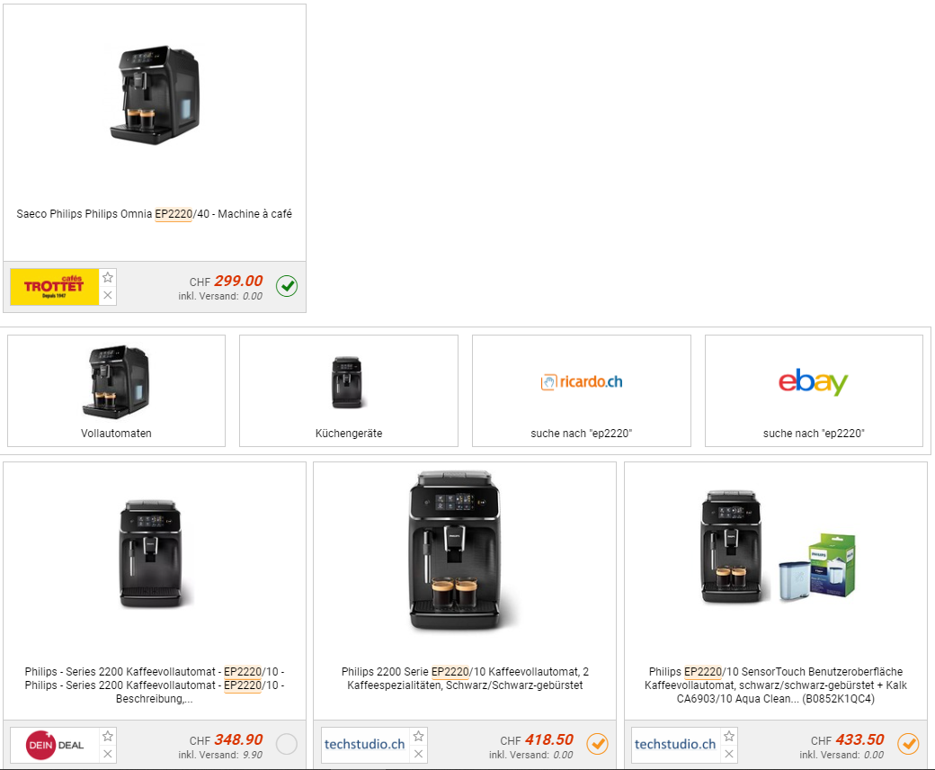 Bei amazon.fr gibts derzeit den Kaffeevollautomaten EP2200/10 von Philips zum Aktionspreis von 243 Franken inkl. Lieferung. In der Schweiz starten die Preise für diese Variante derweil bei 299 Franken, die Maschine mit der abgeänderten Nummer EP22200/19 wäre sogar erst ab 479 Franken erhältlich, inwiefern sich die beiden unterscheiden weiss ich aber nicht.
