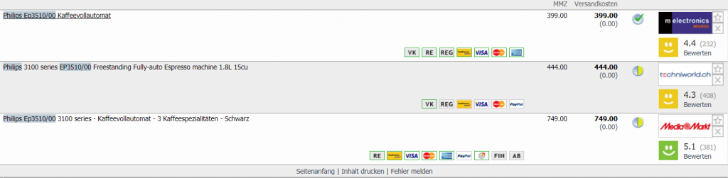 Bei melectronics erhält man den Kaffee-Vollautomaten Philips EP3510/00 mit den Gutscheincodes für 349.10. Der zweitbeste Preis in der Schweiz beträgt laut toppreise CHF 444.- MediaMarkt verlangt für die gleiche Kaffeemaschine sogar CHF 749.-