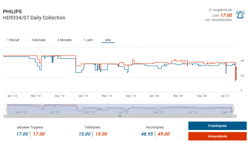 Im Onlineshop von Philips Schweiz gibts derzeit den Wasserkocher HD9334/07 wieder einmal zum Bestpreis von um die 15 Franken, inkl. Versandkosten. Wenn ihr euch zum Newsletter anmeldet spart ihr weitere 20% mit dem erhaltenen Gutschein und kommt auf den Dealpreis von CHF 13.60.