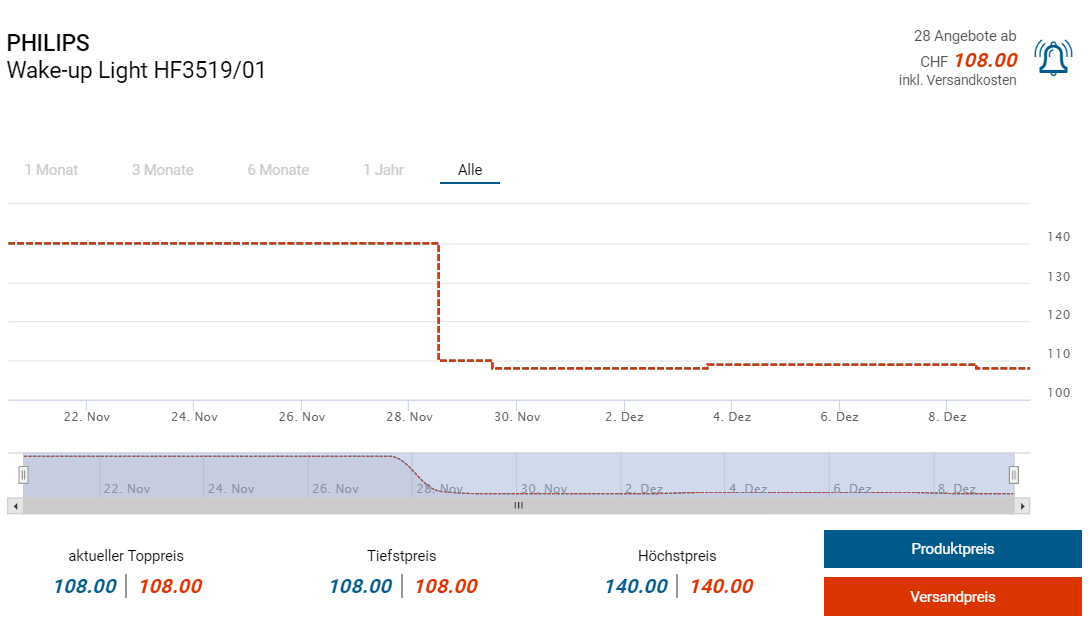 Bei Amazon gibts zurzeit das Wecklicht HF3519/01 von Philips zum Aktionspreis von knapp 82 Franken. Laut toppreise soll der Vergleichspreis hierfür in der Schweiz bei 108 Franken starten.