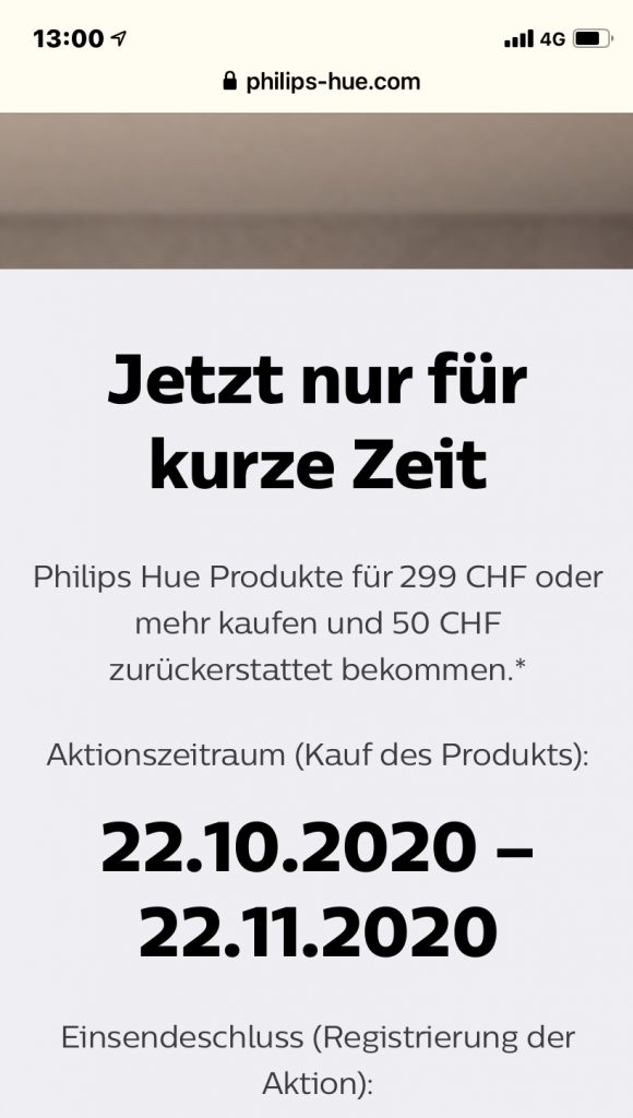 Bei Migros Do It und Garden gibts seit ein paar Wochen 25% auf diverse Philips Hue Artikeln. Ab Chf 299 gibts zusätzlich Chf 50.— Cashback