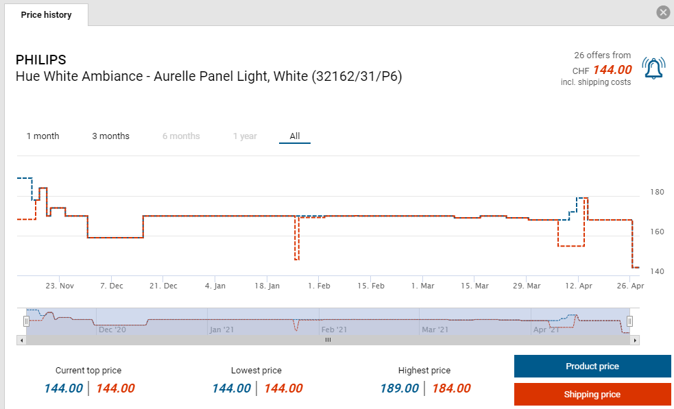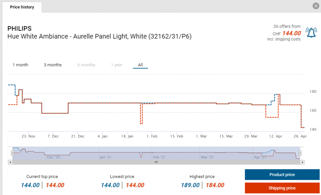 Bei microspot gibt’s die Philips Hue Aurelle in limitierter Stückzahl zum Bestpreis. Zweitbestes Angebot (ebenfalls in Aktion z.Z.) liegt bei CHF 153.- von digitec/Galaxus.
