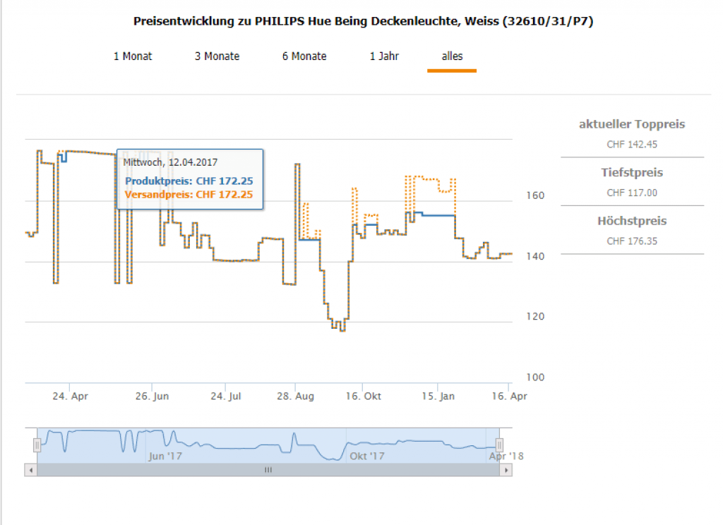 Im letzten Oktober gab es die Leuchten bereits einmal für den Preis von 117 CHF. Seither aber nie mehr unter 140 CHF.