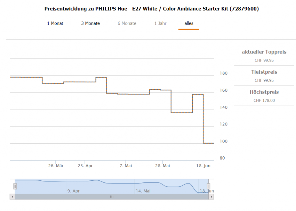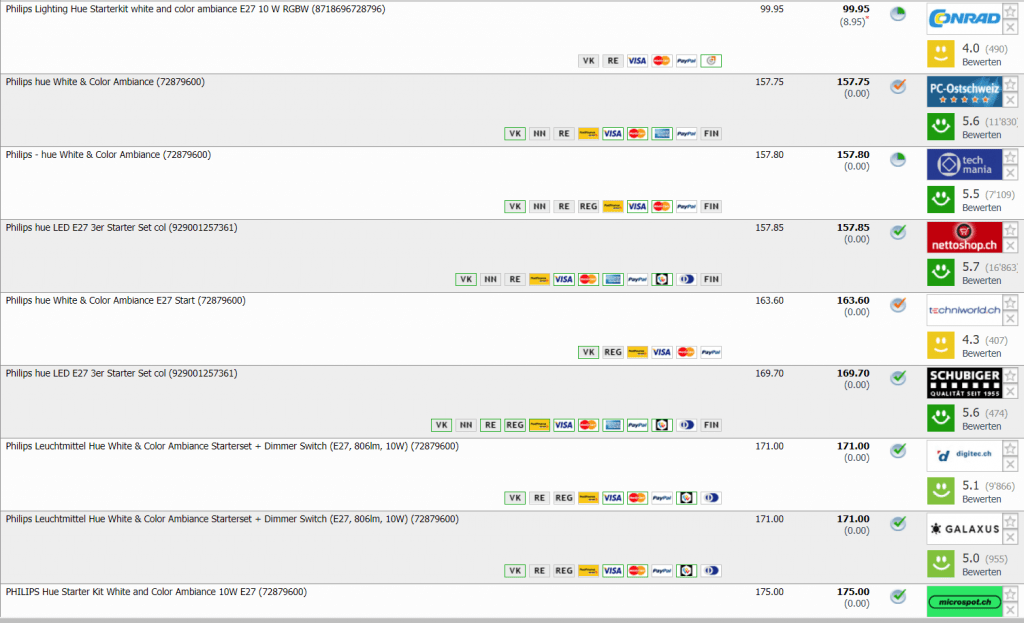 Bei Conrad gibt’s momentan das Philips Hue E27 White / Color Ambiance Starter Kit für CHF 99.95. Mit dem Gutscheincode PB1810 gibt’s nochmals 10.- Rabatt obendrauf. Dazu kommt noch eine Lieferpauschale von CHF 8.95 Was ein Preis von total CHF 97.10 ergibt. Der zweitbeste Preis beträgt CHF 157.75. Günstiger als für CHF 135.95 erhielt man das Starter Kit in der Schweiz bisher noch nie.